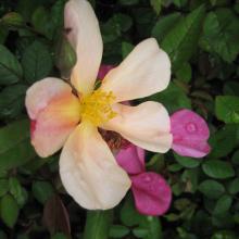 China rose. Single buff blooms change with age to orange and then finally crimson. Also known as the Butterfly Rose as the flowers look like butterflies covering the bush. It repeat flowers for about 10 months of the year and then produces tiny rose hips. Has a slight scent.