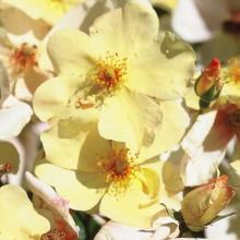 Single blooms of attractive pale apricot that fade to white. Has a big spring flush and then intermittently repeats all season right into autumn, followed by small red hips. Bred by Ken Nobbs. A much admired bush, named after Samuel Marsden's first sailing ship. A great rose for a hedge.